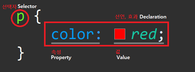 선택자가 지정한 태그에 어떠한 효과를 줄 건지 정의하는 부분이 선언부분이며