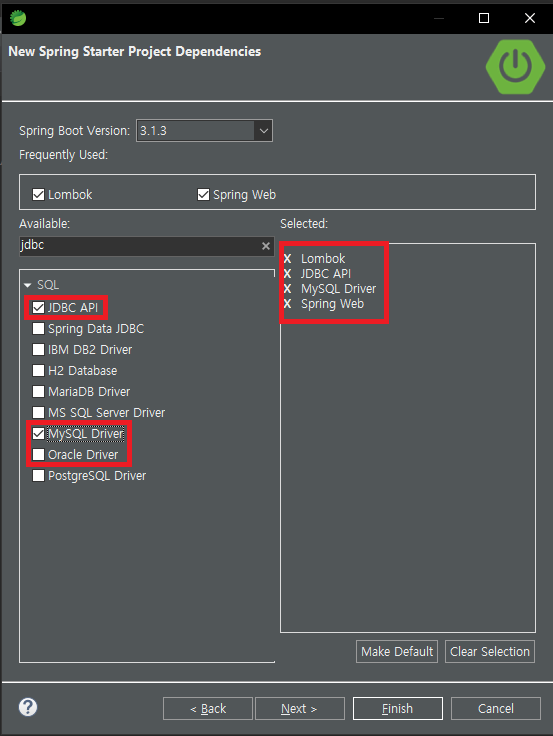 프로젝트 설정시 JDBC API와 사용할 데이터베이스의 Driver를 추가해준다
