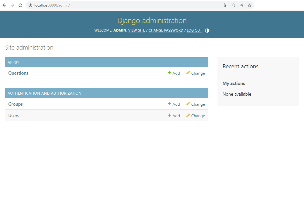 admin.py를 위와 같이 작성하며 관리자 페이지에 Question 모델 또한 추가된다