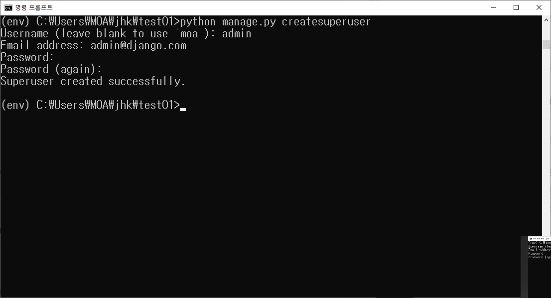 장고 관리자를 사용하기 위해서는 관리자 화면에 접속할 수 있는 슈퍼유저를 생성해야 한다