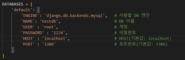 'PORT' : '3306' # 포트번호(기본값: 3306)