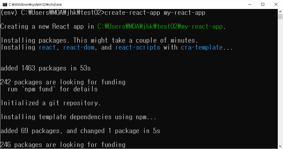 Success! Created my-react-app at C:\Users\MOA\jhk\test02\my-react-app