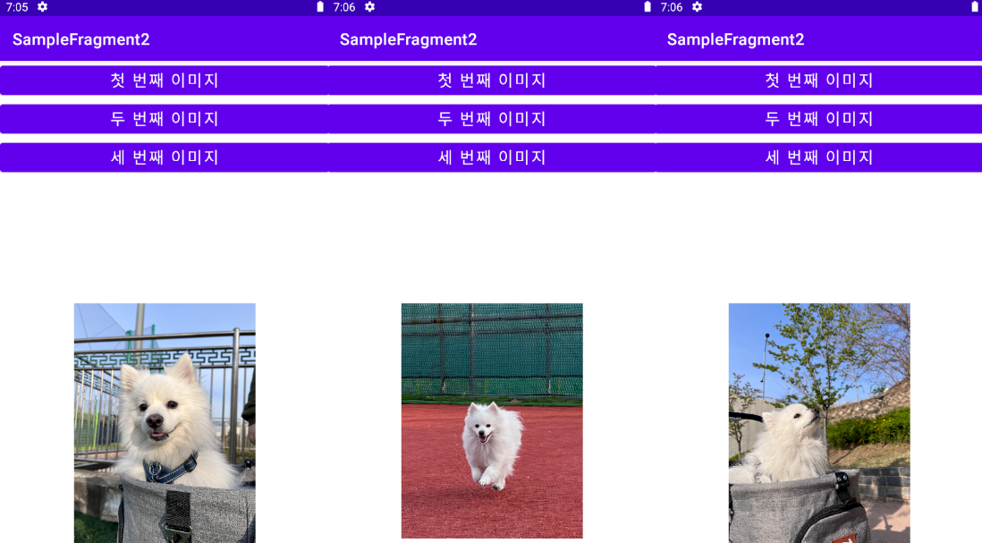 [첫 번째 이미지], [두 번째 이미지], [세 번째 이미지] 버튼을 누르면 각각의 이미지로 이미지뷰가 바뀐다